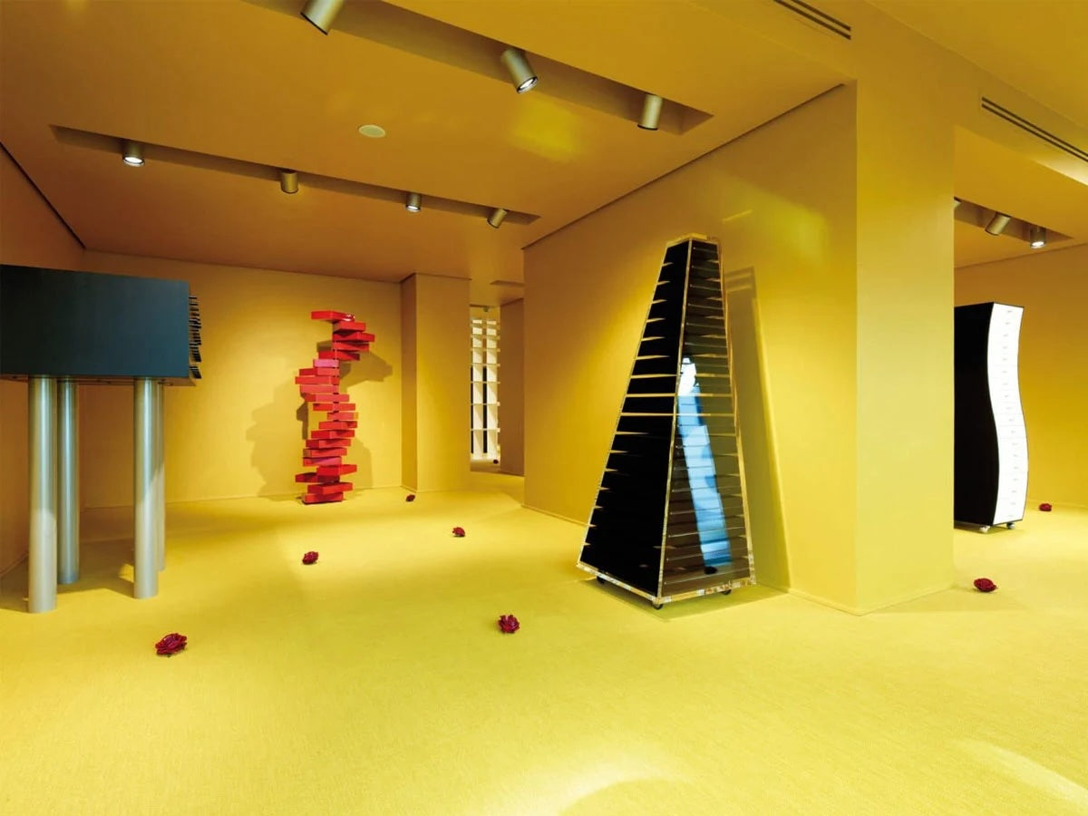 The Pyramid Cabinet is a striking pyramid-shaped structure composed of 17 black transparent acrylic drawers on castors, all encased within clear glass. Designed by Shiro Kuramata in 1968 for the Italian manufacturer Cappellini, its swivel wheels allow effortless movement, while the bold form evokes the grandeur of ancient pyramids. A true design icon, Kuramata epitomized the creative spirit of his era through his imaginative and boundary-pushing works. His designs remain remarkably modern today, with many housed in the permanent collections of prestigious institutions such as the Museum of Decorative Arts in Paris, MoMA in New York, the Metropolitan Museum, the Vitra Design Museum, and the Museum of Modern Art of Toyama.